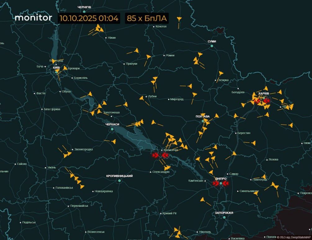 Наблюдатели утверждают, что в небе над страной фиксировалось более сотни беспилотников типа «Герань», направляющихся в сторону Киева, и их число превысило полторы сотни. После этого последовали мощнейшие взрывы — сообщается также о ракетных ударах.