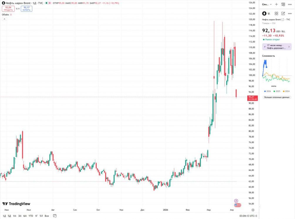 Утром 8 апреля стоимость июньских фьючерсов на нефть марки Brent crude oil опустилась до 91,92 доллара за баррель, потеряв более 12% и впервые с конца марта пробив отметку в 92 доллара. В то же время майские фьючерсы на WTI crude oil снизились еще сильнее — до 94,1 доллара, что означает падение более чем на 16%.