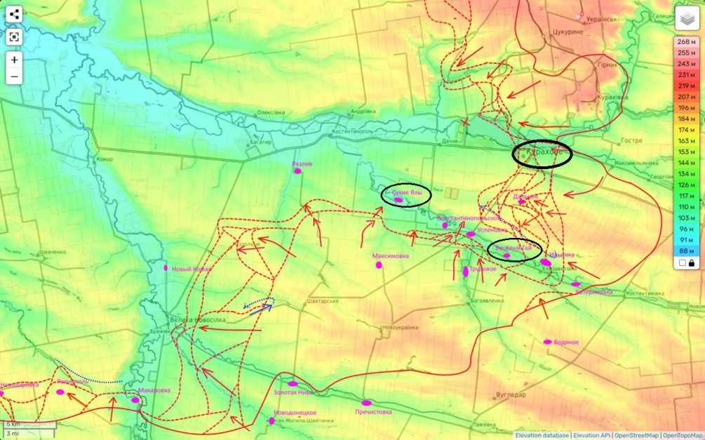На Кураховском направлении продолжаются интенсивные боевые действия, особенно в районе реки Сухие Ялы и самого Курахово. Несмотря на то что противник смог частично стабилизировать свою позицию, наши войска продолжают оказывать давление на его позиции, особенно с южного фланга. В частности, наблюдается продвижение в районе Константинопольского, а также активные бои за Весёлый Гай. Эти действия являются частью более широкого стратегического плана, направленного на перерезание важной трассы Курахово-Запорожье.