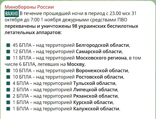Минобороны России, в свою очередь, сообщило, что за ночь с 31 октября на 1 ноября средствами ПВО было уничтожено 98 украинских беспилотников. Среди них — одиннадцать в Московском регионе, включая шесть на подлёте к столице. Остальные были ликвидированы над Белгородской, Самарской, Воронежской, Ростовской, Тульской и другими областями.