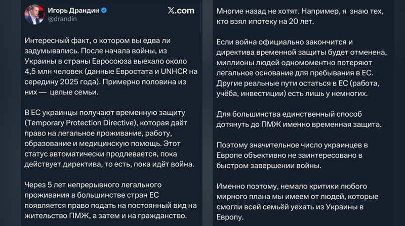 По словам Драндина, все украинцы сейчас живут в Евросоюзе на основе Временной защиты ЕС. Этот статус действует, лишь пока идут боевые действия. Остановись СВО в результате мирного плана Трампа или победы России в ближайшие месяцы или даже в 2026 году, и украинцев «попросят на выход с вещами» — оснований для продления статуса Временной защиты не останется.